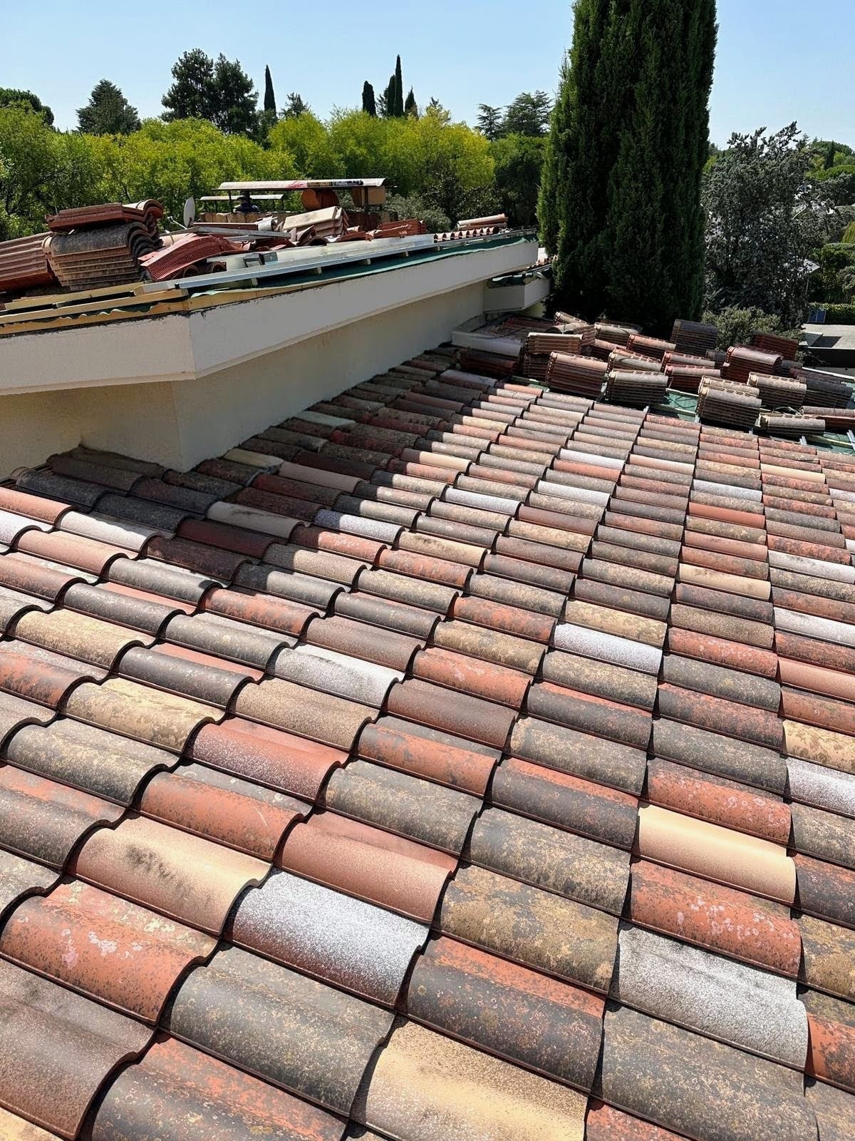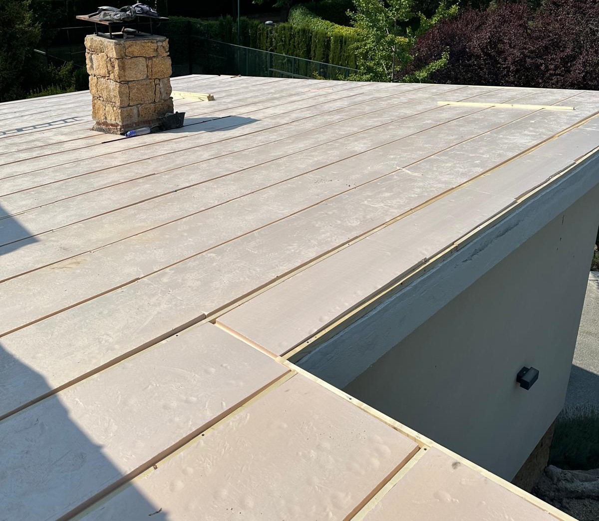 Instalación de estructura de soporte con rastreles galvanizados, colocación de sistemas de remate y peines antipájaros, y colocación de variedad de teja mixta cerámica.